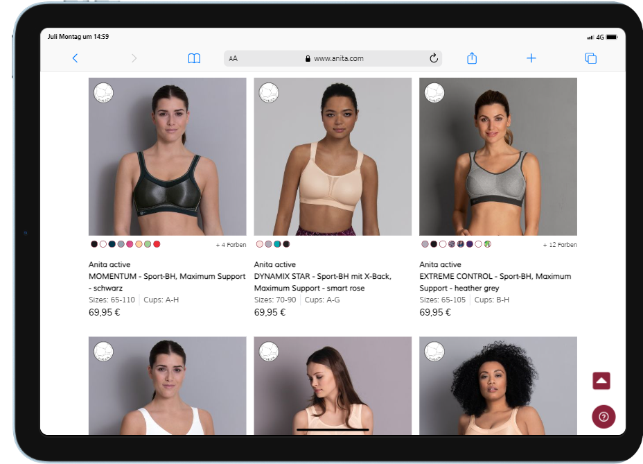 Das ist abhängig von Deiner Brustform, Deiner Brustgröße und der Beschaffenheit Deines Bindegewebes. Grundsätzlich ist bei allen Größen ein Sport-BH empfehlenswert. Er gibt Dir den nötigen Halt, ohne einzuengen. Dann gibt es noch ein weiteres Auswahlkriterium: Deine Sportart. Für leichtere Sportarten wie Yoga oder Pilates reicht ein Sport-BH mit wenig Support, beim Marathon oder Reiten brauchst Du starken Halt – wir nennen ihn Maximum Support. Bei Anita active findet jede Frau den richtigen Sport-BH. Anita active bietet Dir große Auswahl verschiedener Schnitte – angefangen bei Cupgröße AA bis hin zum K-Cup und zur Unterbrustweite 105.