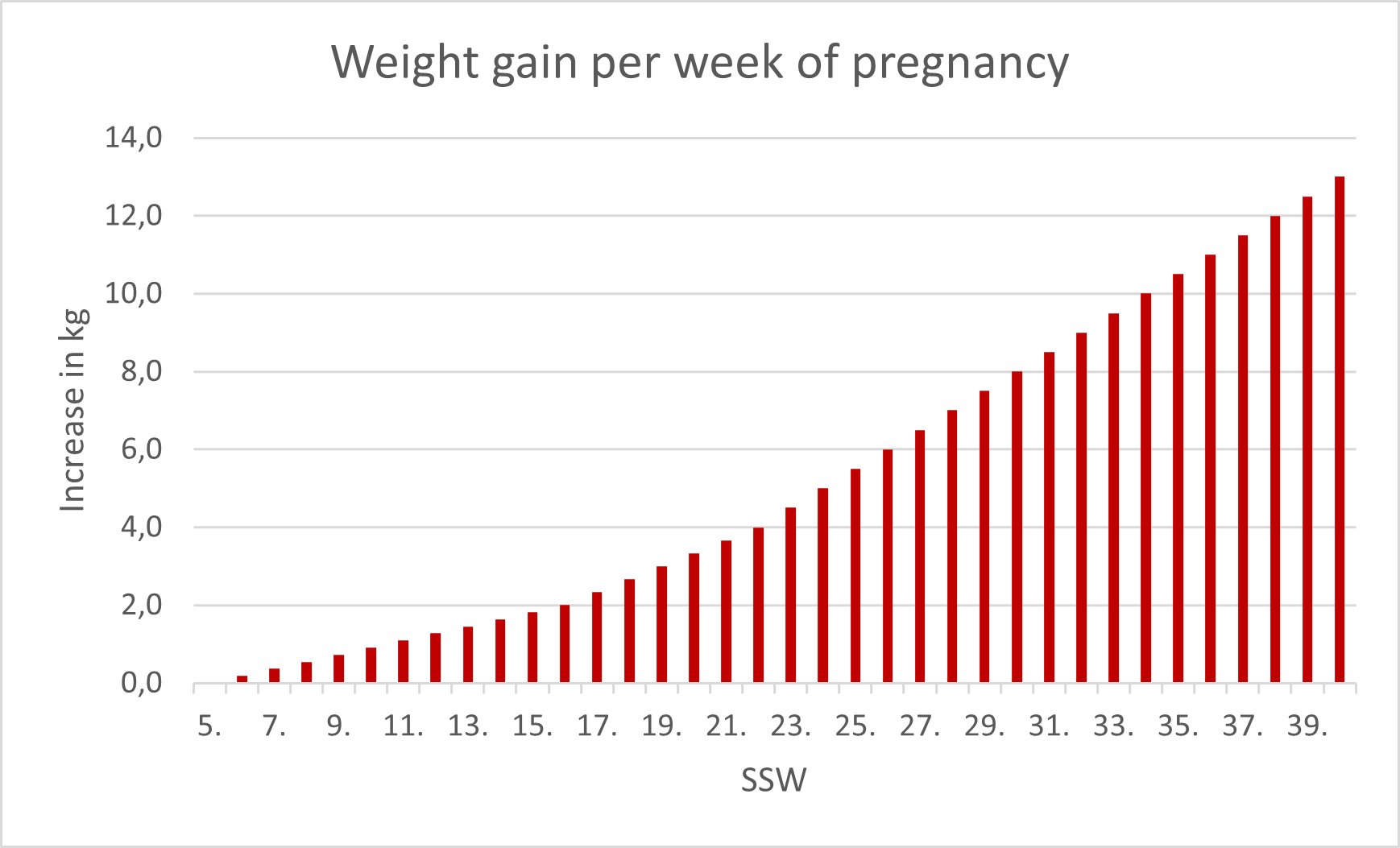 Weight gain during pregnancy varies depending on the trimester. The first trimester often shows a small increase. The second and third trimesters show a steady increase as the baby grows. However, the blood volume also increases and the body stores water and fat for breastfeeding. As expected, the weight occasionally jumps, but as long as it remains within the target range, there is no cause for concern. Midwives and gynaecologists often look at the weight gain per week if you are overweight/underweight or have pre-existing conditions.